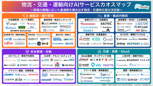 AIポータルメディア「AIsmiley」を運営するアイスマイリーは10日、現場の課題に応じた最適解を導き出す物流・交通特化型の決定版「物流・交通・運輸向けAIサービスカオスマップ」公開した。掲載総数は90製品以上。